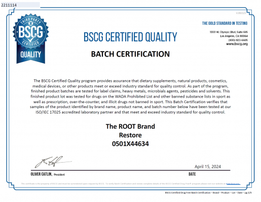 ROOT Restore wurde von unabhängigen ISO-zertifizierten Laboren geprüft und erfüllt höchste Qualitätsstandards. Die BSCG-Zertifizierung bestätigt, dass jede Charge auf Reinheit getestet wird und frei von verbotenen Substanzen ist. Du erhältst ein Produkt, das höchsten wissenschaftlichen Anforderungen entspricht.